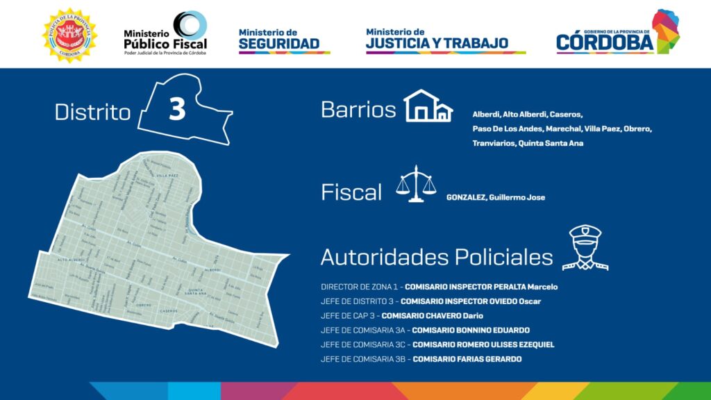 - En el nuevo Distrito 3 estarán comprendidos los barrios Alberdi, Alto Alberdi, Caseros, Paso de los Andes, Marechal, Villa Páez, Obrero, Tranviarios y Quintas Santa Ana. El fiscal asignado por el Ministerio Público Fiscal será Guillermo José González, mientras que las autoridades policiales estarán encabezadas por el comisario inspector Marcelo Peralta (director de Zona 1), comisario inspector Oscar Oviedo (jefe del Distrito 3), comisario Eduardo Bonnino (jefe de Comisaría 3A), comisario Gerardo Farías (jefe de Comisaría 3B) y comisario Ulises Romero (jefe de Comisaría 3C).