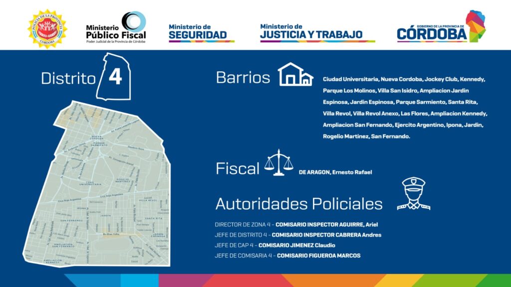 - En el nuevo Distrito 4 estarán comprendidos los barrios Ciudad Universitaria, Nueva Córdoba, Jockey Club, Kennedy, Parque Los Molinos, Villa San Isidro, Ampliación Jardín Espinosa, Jardín Espinosa, Parque Sarmiento, Santa Rita, Villa Revol, Villa Revol Anexo, Las Flores, Ampliación Kennedy, Ampliación San Fernando, Ejército Argentino, Iponá, Jardín, Rogelio Martínez y San Fernando. El fiscal actuante será Ernesto Rafael De Aragón, mientras que las autoridades policiales estarán encabezadas por el comisario inspector Ariel Aguirre (director Zona 4), comisario inspector Andrés Cabrera (jefe del Distrito 4), comisario Claudio Jiménez (jefe del CAP 4) y comisario Marcos Figueroa (jefe de Comisaría 4).