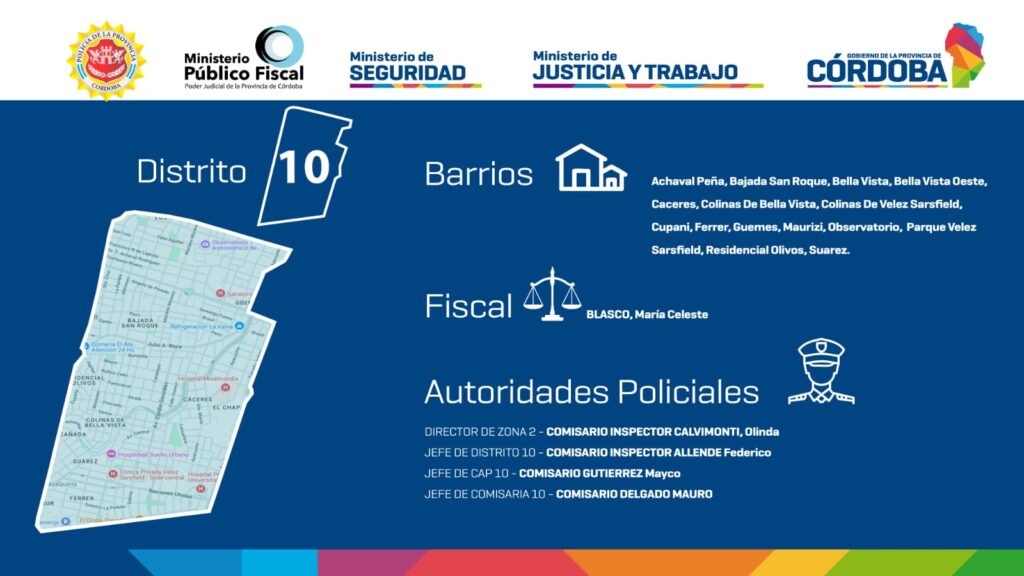 - En el nuevo Distrito 10 estarán los barrios Achával Peña, Bajada San Roque, Bella Vista, Bella Vista Oeste, Cáceres, Colinas de Bella Vista, Colinas de Vélez Sársfield, Cupani, Ferrer, Güemes, Mirizzi, Observatorio, Parque Vélez Sársfield, Residencial Olivos y Suárez. La fiscal designada es María Celeste Blasco, mientras que las autoridades policiales serán el comisario inspector Olinda Calvimonti (directora de Zona 2), comisario inspector Federico Allende (jefe del Distrito 10), comisario Mayco Gutiérrez (jefe del CAP 10) y comisario Mauro Delgado (jefe de Comisaría 10).